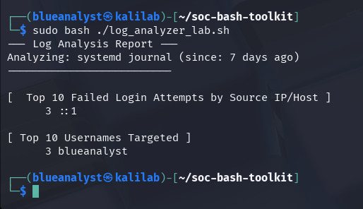In a real SOC environment, this same script could reveal brute-force attacks, targeted users, and suspicious sources.